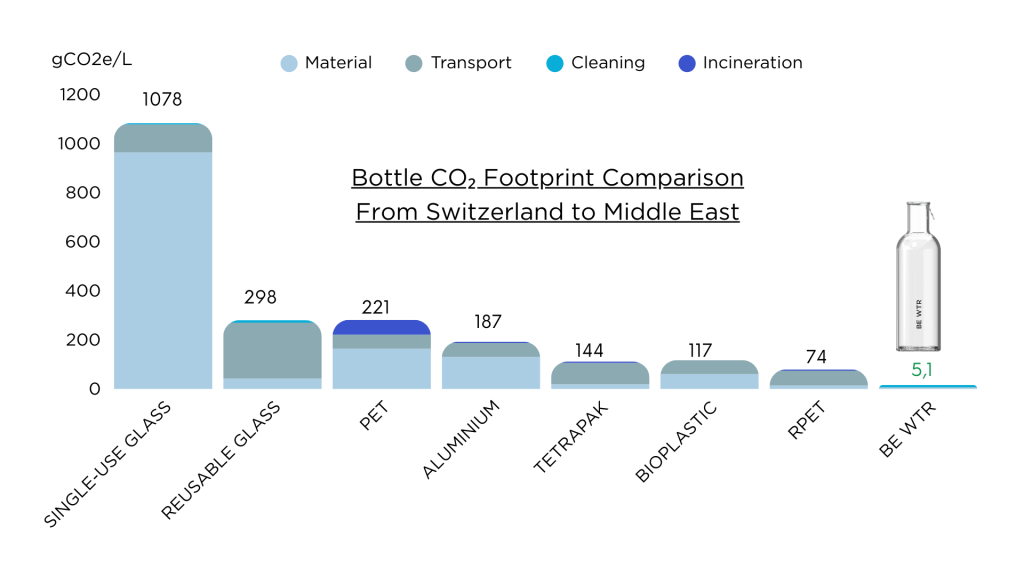 Our carbon comparison chart reveals the dramatic differences between traditional packaging formats and BE WTR’s approach. The chart below shows the CO₂ footprint per liter for bottles shipped from Switzerland to the Middle East: