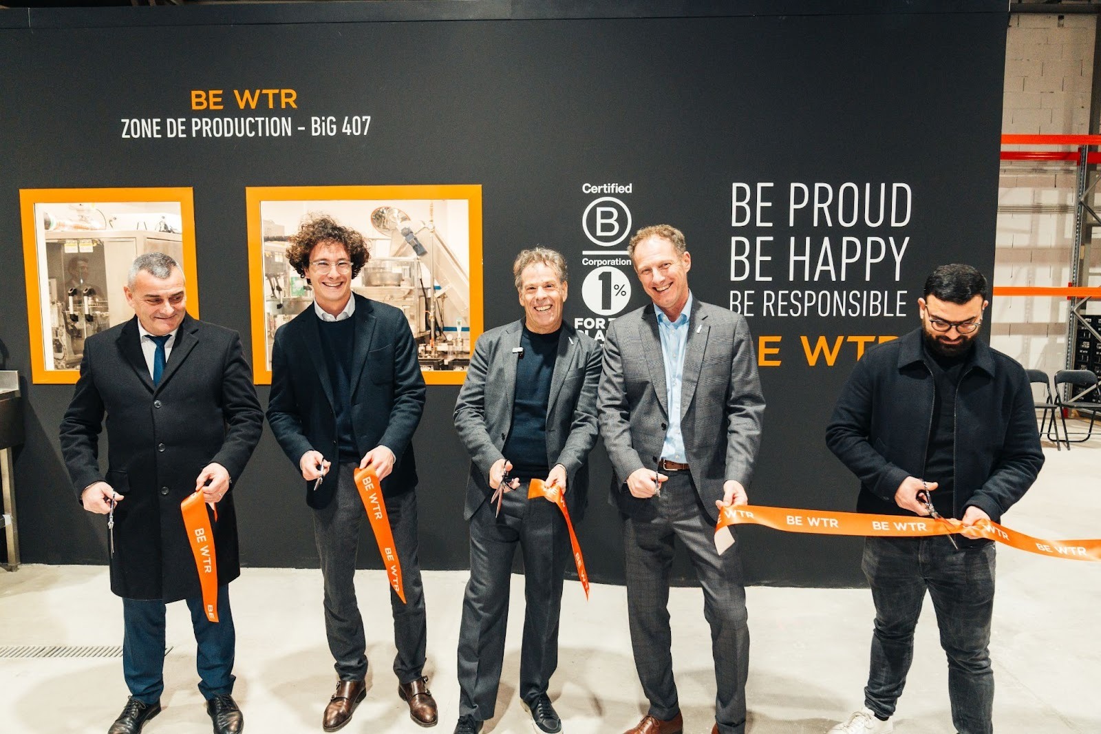 The ribbon cutting brought together Gautier Richard, Managing Director France at BE WTR, Jonathan McNicol, President France at BE WTR, Mike Hecker, Founder of BE WTR, Saïd Wedherfi, Production Sites Manager for the South of France, and Hervé Paul, Vice President for Water, Sanitation and Energy at the Metropolitan Executive Board, and Mayor of Saint Martin du Var.
